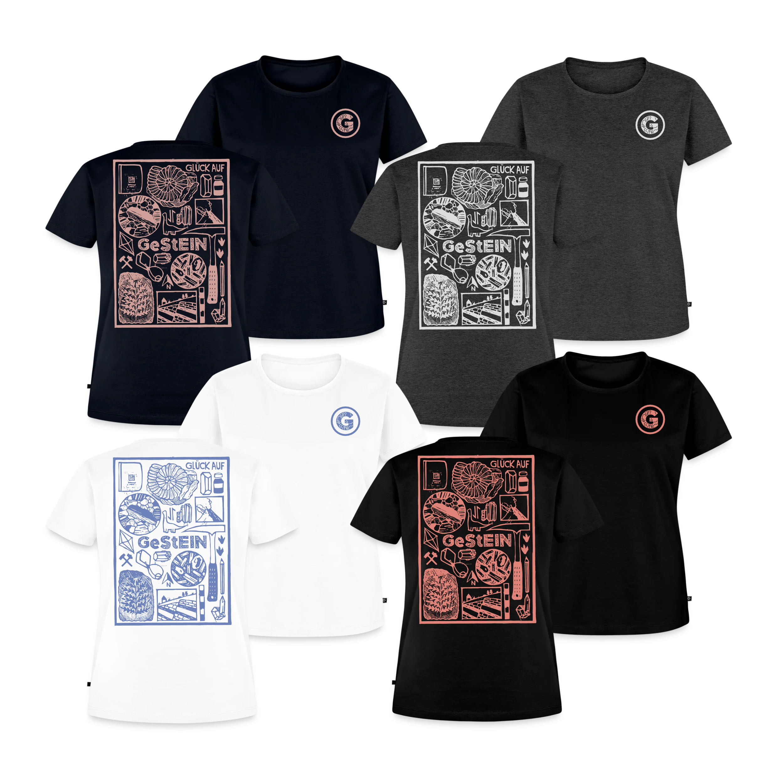 You can order this shirt in black : red (schwarz : gesteinsrot), navy : rosé, white : blue (weiß : blau) or charcoal heather : light gray (anthrazit meliert : hellgrau).